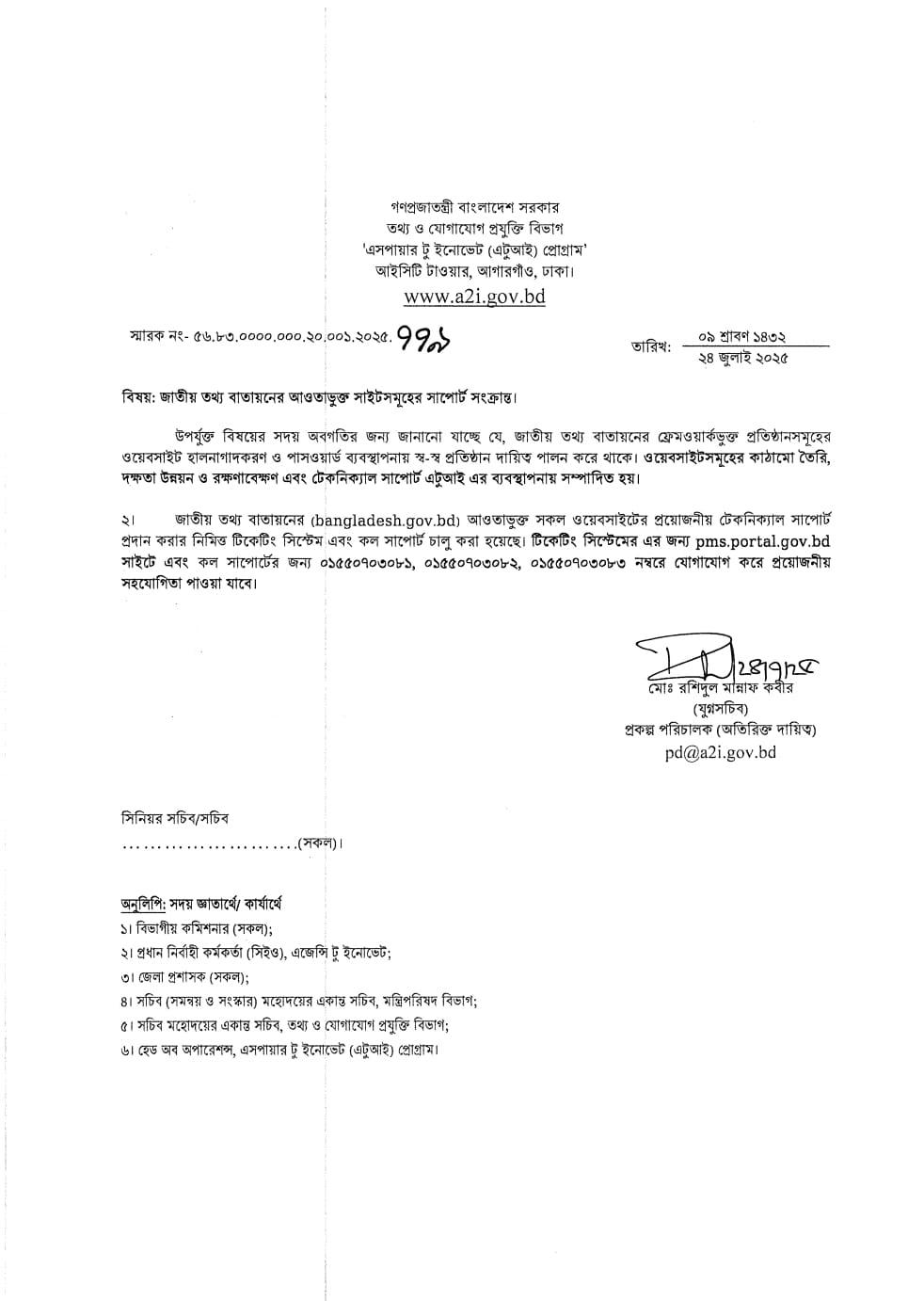 | ৬ | জাতীয় তথ্য বাতায়নের আওতাভুক্ত সাইটসমূহের সাপোর্ট সংক্রান্ত। | | | ৩০-০৭-২০২৫ | দেখুন |
